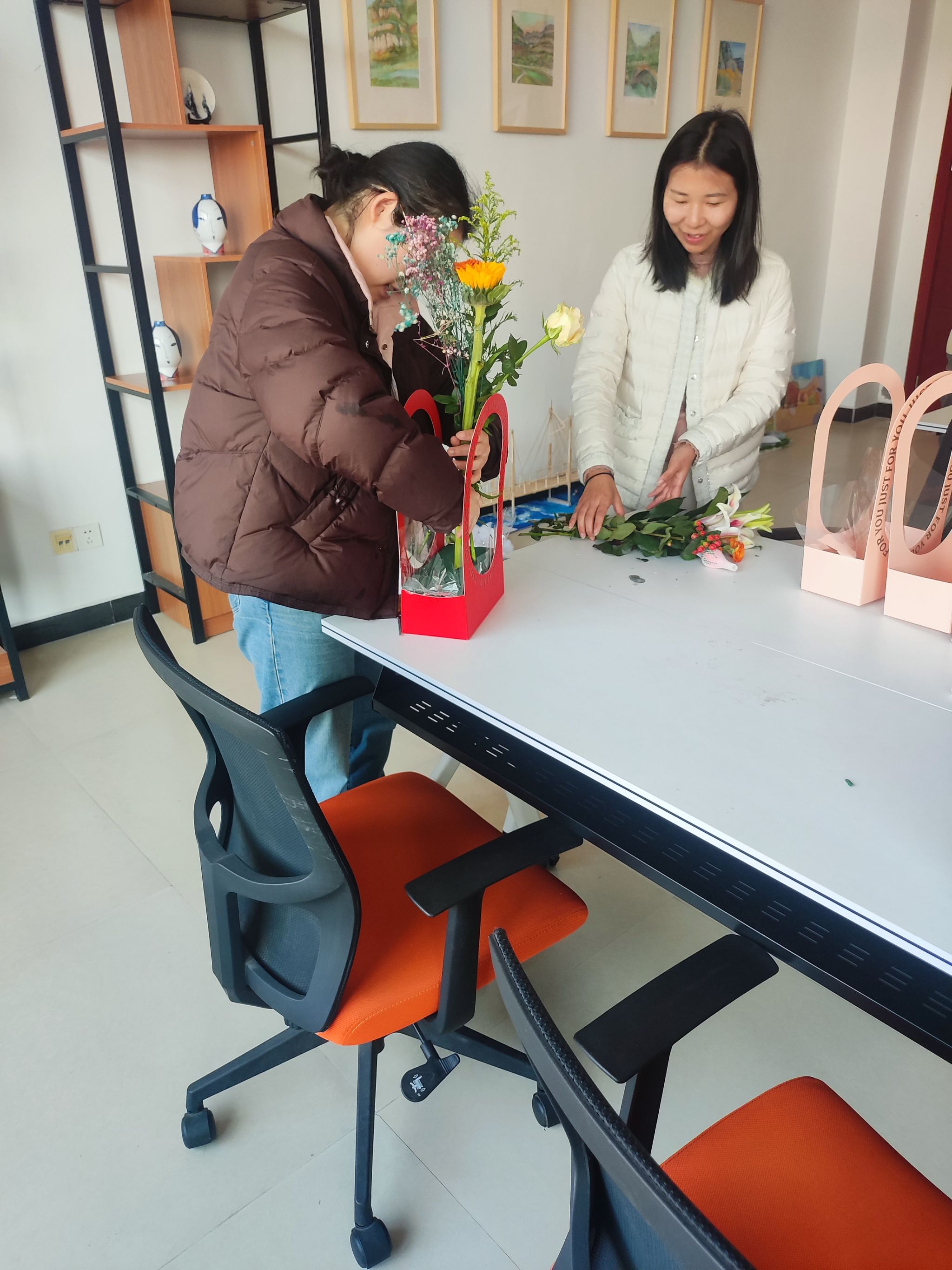 活动现场,花香氤氲,笑语盈盈,平日里习惯于与图纸、模型和电脑打交道的女教职工们,此刻化身成了温婉的花艺师。在轻松愉快的氛围中,大家发挥专业特长,用心选材、精心修剪、巧妙搭配。粉色的康乃馨、热情的玫瑰、灿烂的向日葵、灵动的满天星…… 原本普通的花草,经过大家的巧手整枝、构思与塑形,变成了一件件错落有致、独具匠心的花艺作品。