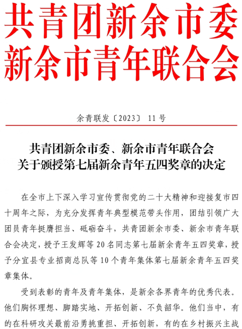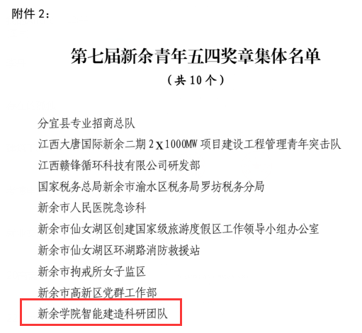 近日,共青团新余市委新余市青年联合会印发了《关于颁授第七届新余青年五四奖章的决定》,公司智能建造科研团队荣获第七届“新余青年五四奖章集体”荣誉称号。