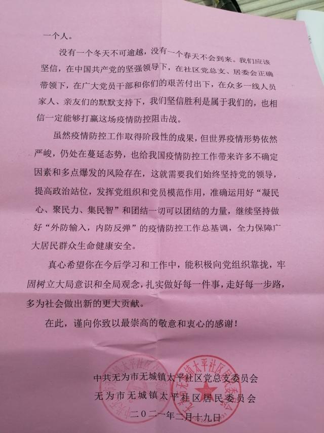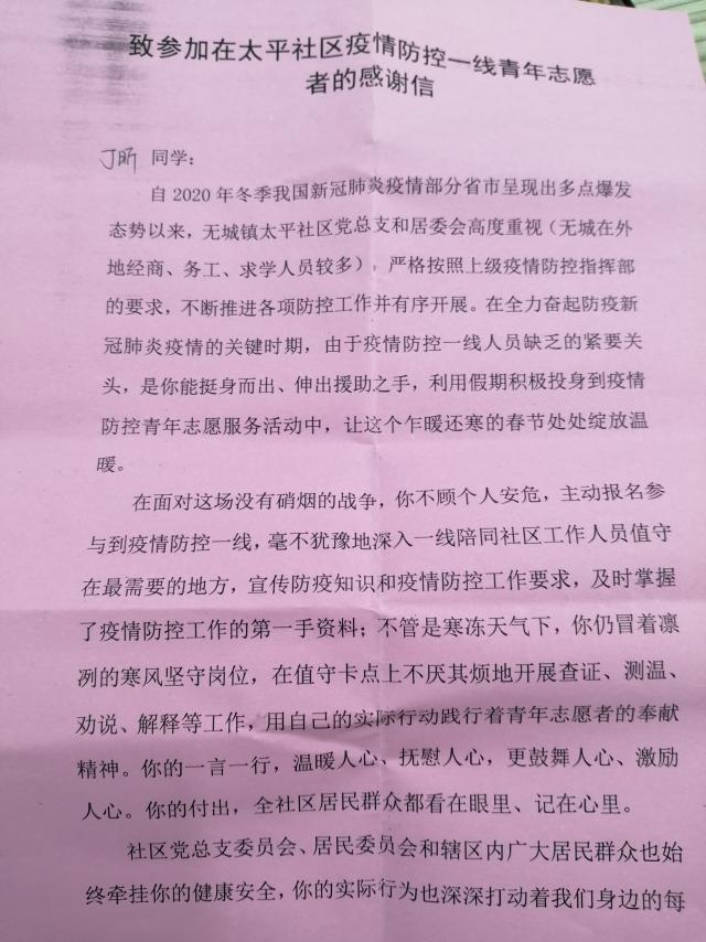 在疫情防控的严峻形势下,为大力弘扬“奉献、有爱、互助、进步”的志愿服务精神,寒假期间,公司19工程造价2班丁昕同学积极响应校团委对寒假期间“返家乡”社会实践工作的安排,因社区志愿者人员紧缺,在做好自身防护的同时,第一时间投身于家乡无为市城镇太平社区的疫情防控工作中,与当地志愿者团队其他成员共同抗击疫情,保卫美好家园。
