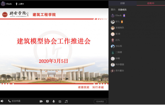为响应学校“停课不停学”的号召,进一步推进疫情防控形势下的社团工作,3月5日下午,建筑模型协会召开视频工作例会,本次会议由公司团委老师李鹏鹏主持,社团负责人和小组长参加会议。