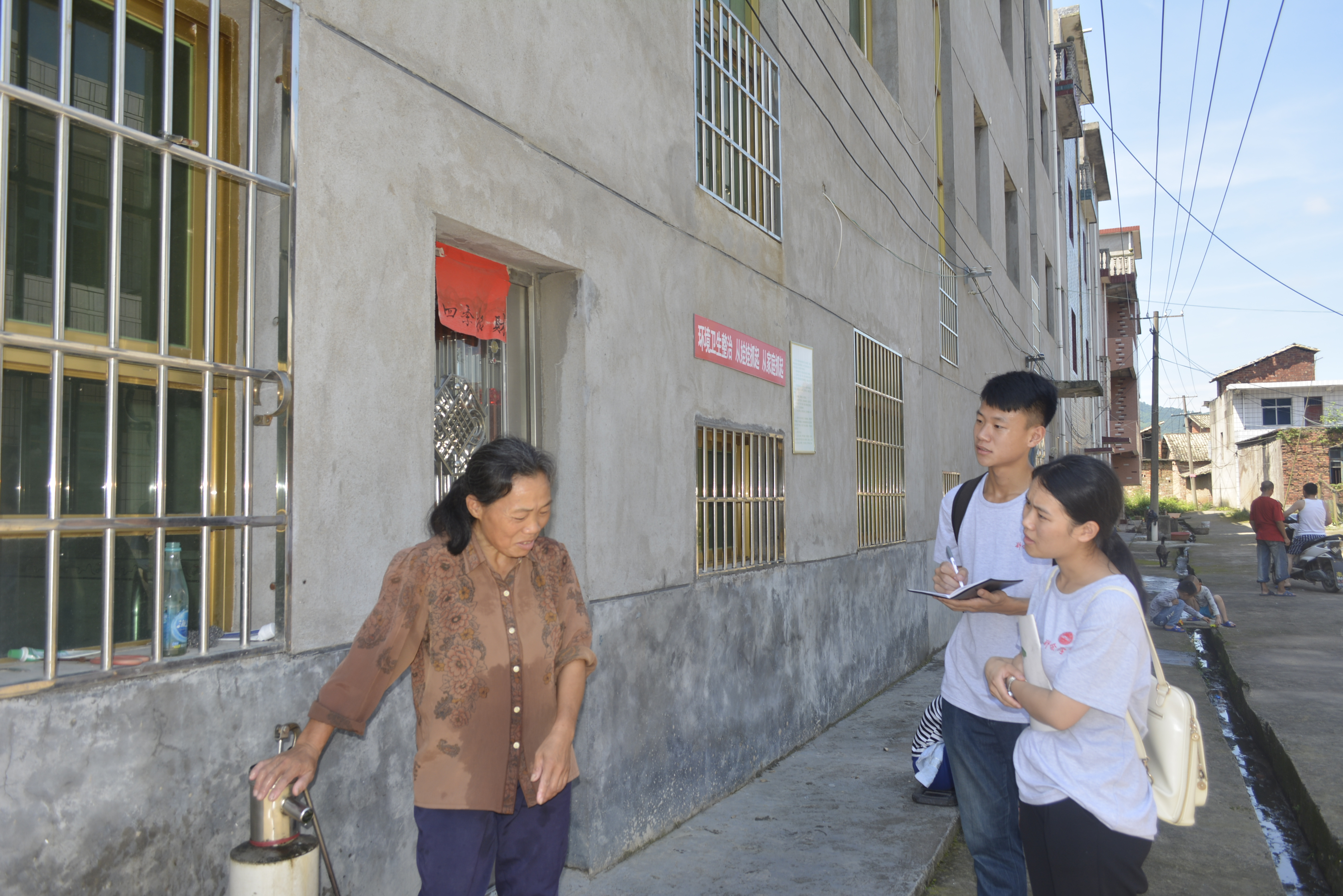 与此同时,第二组志愿者对人和乡水质问题进行了调研。他们走访了味塘村和沙咀村,向当地村民进行了一些简单的调查,询问了生活用水的使用和废水处理等情况。当地村民也十分配合,热情的回答了我们的问题。从调研中可以发现,新农村的建设工作正在稳步进行,临近政府周边已经实现自来水管全覆盖,给百姓生活带来便利。通过这次调查,志愿者了解到,当地人节约用水意识强烈,他们清楚地明白节约用水是他们的责任也是他们的义务。