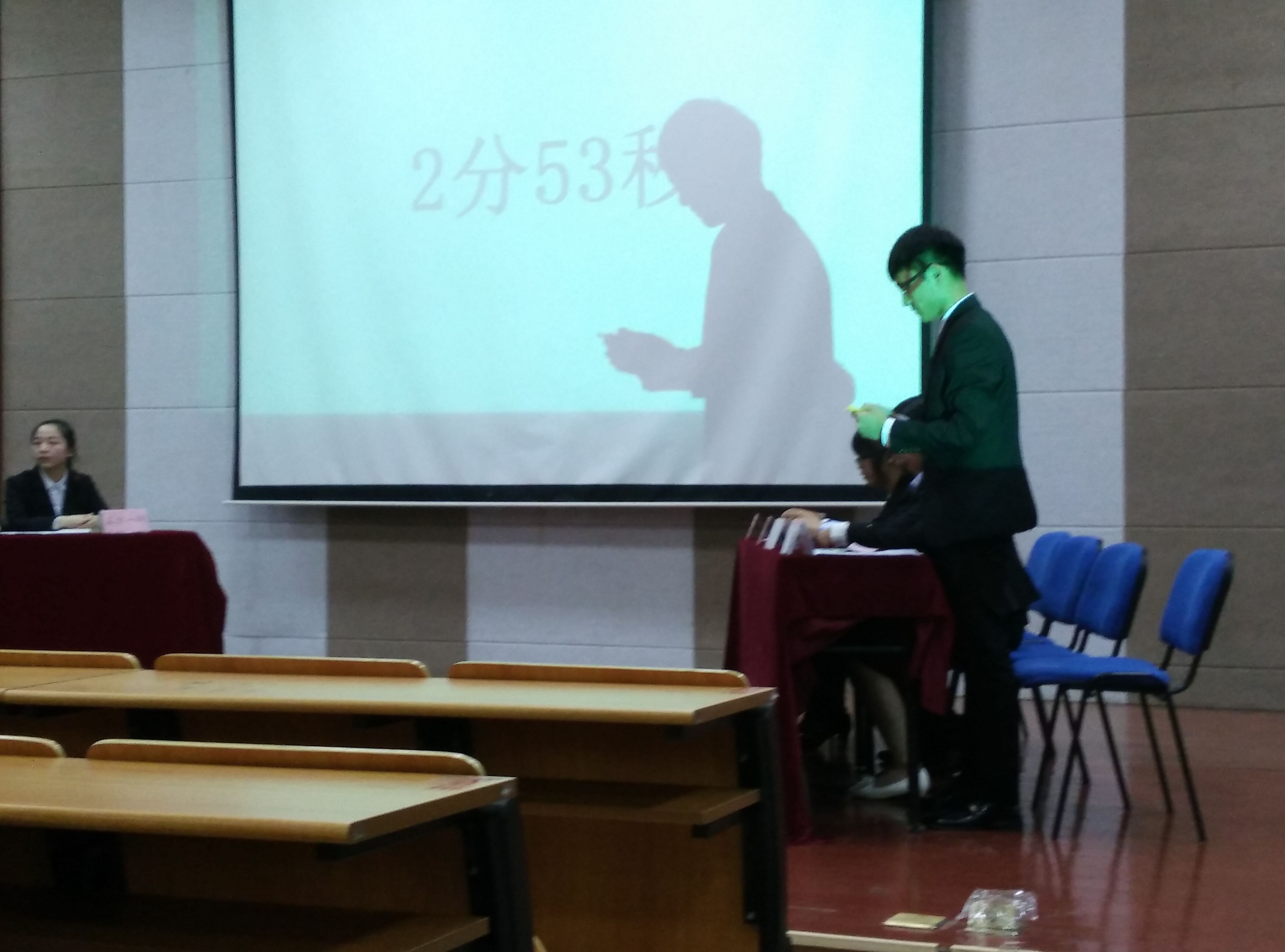 比赛一开始对方文学院的一辩的精锐语言以及华丽丽的身体动作气势相当强大。而公司辩手气势也不低,一辩很激烈,两方对辨题的叙述都很精彩,很丰富。我方在自由辩论环节中占劣势在对方剩余33秒时用完时间,四辨总结很是丰富,语气浑厚,延续了之前的幽默的话锋,获得了观众热烈的掌声。最后评委老师中肯的点评,让我们更能理解这场比赛的结果。