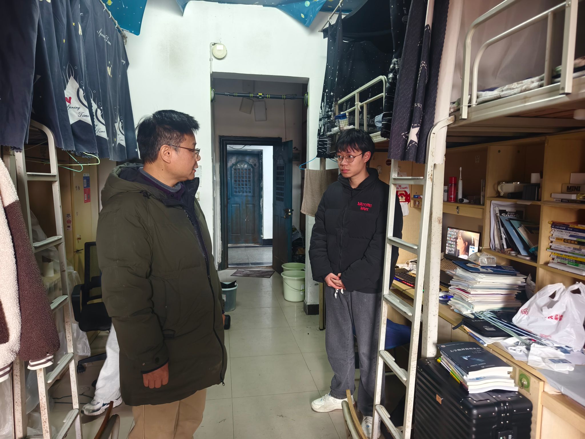 走访过程中,学院领导与同学们亲切交谈,详细询问了大家的假期生活、新学期学习规划等情况,倾听同学们在学业、生活等方面的实际需求与困难。学院领导叮嘱同学们,要尽快调整状态,以饱满的精神面貌投入新学期的学习生活中;要牢固树立安全意识,注意宿舍用电、防火及财产安全,保持宿舍整洁通风,共同营造安全、文明、和谐的居住环境;要珍惜同窗情谊,相互关心、团结互助,建立融洽的宿舍人际关系。同时,学院领导们也特别关注同学们的心理健康状况,鼓励大家遇到困惑或压力时,积极与辅导员、学院沟通,主动寻求帮助与支持。
