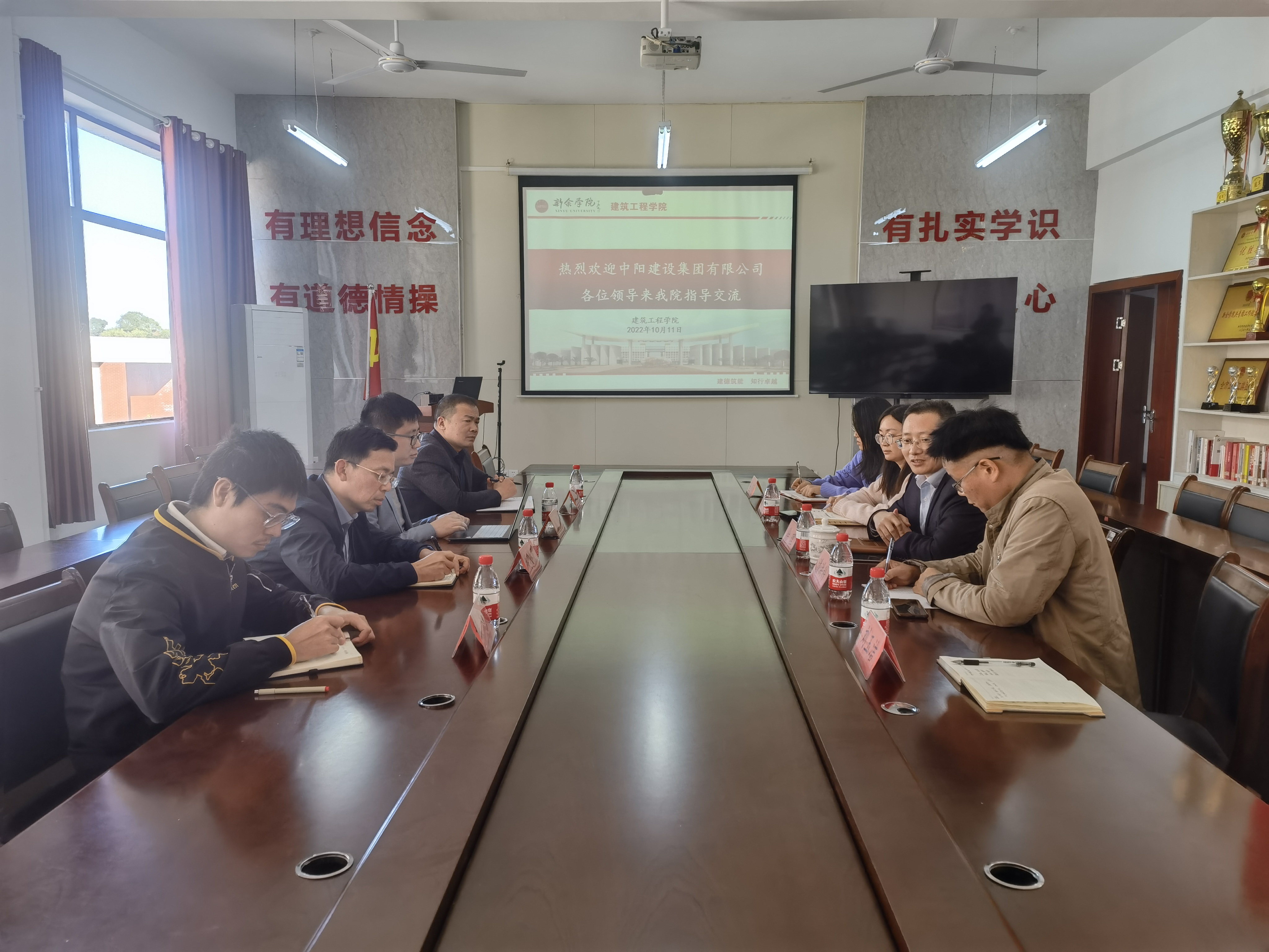 2022年10月11日下午,中阳建设集团副总裁吴轶强,研究院经理彭雄,研砼总经理蒋思朋,建筑师程杰一行到我学院进行指导交流。公司经理、书记徐理,副经理潘洪科,组织科、实践科相关人员接待了来客。