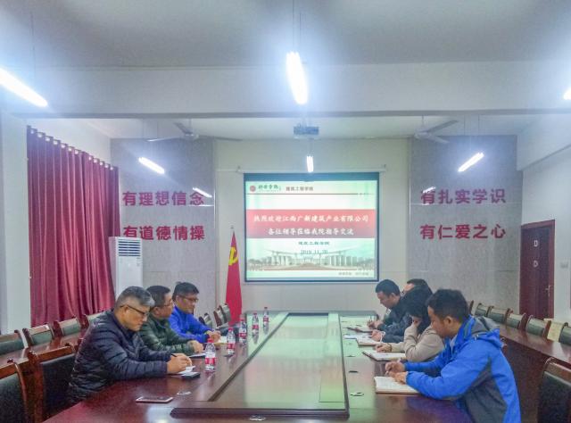 11月20日,江西广新建筑产业有限公司丁立民副总经理一行到公司洽谈合作事宜,学院负责人徐理主持洽谈会,副经理张小义、办公室主任张建营博士、实践科负责人曾海明共同参加。