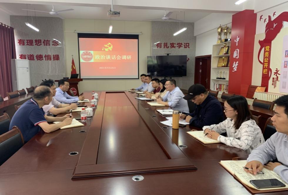 5月25日下午,公司党委书记刘冬就政治谈话工作到公司开展前期实地调研,公司党委委员、组织部部长姚伟,公司党委委员、宣传部部长周文生,公司党政办主任王茶生陪同调研,公司党委班子成员,教工支部书记及员工支部书记参加调研会。