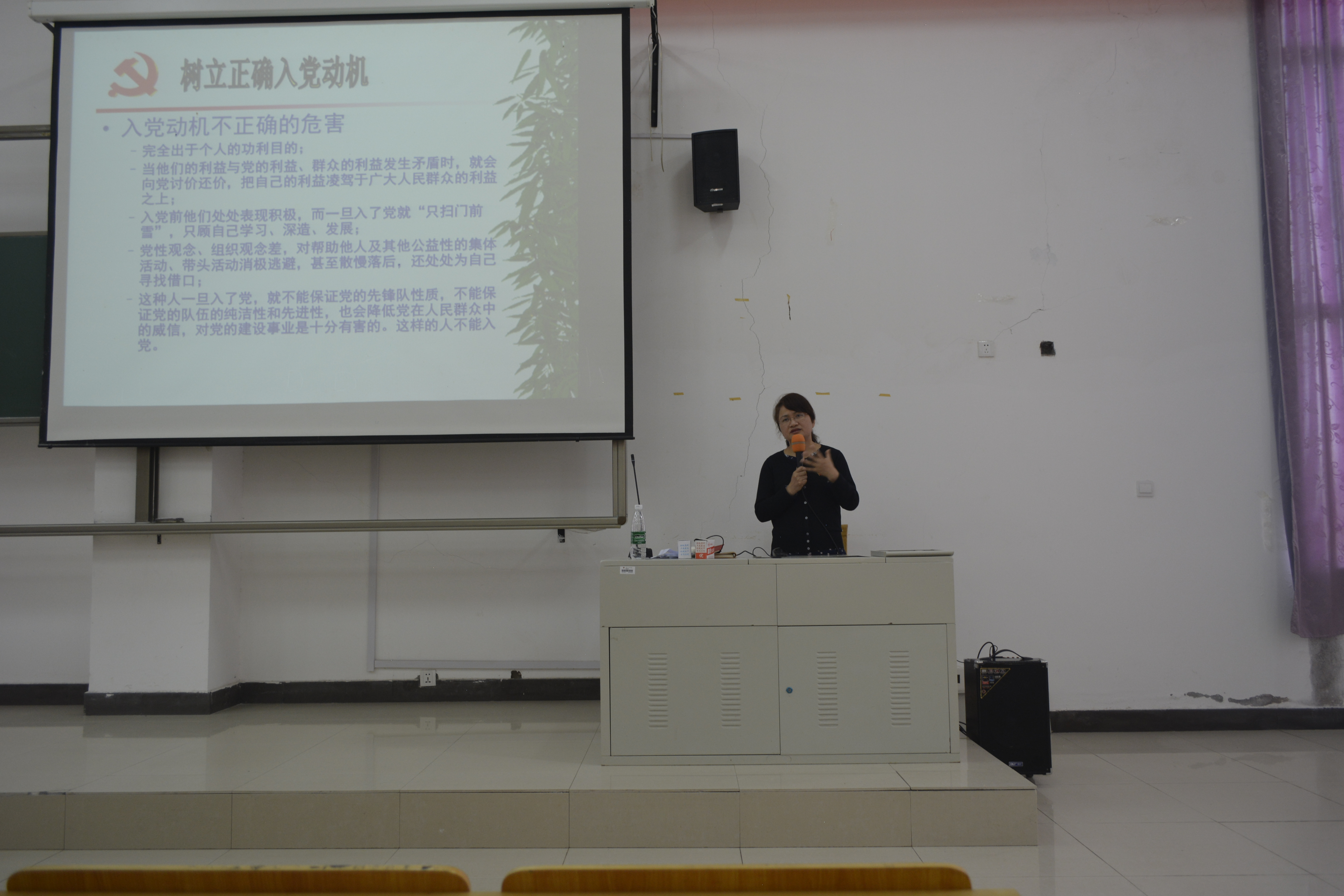 课上,钟益兰副书记要求大家树立正确的入党动机,争取做一名合格的共产党员。她强调青年人应有 “组织上入党一生一次,思想上入党一生一世”的思想觉悟,入党积极分子应在平时的学习工作中,都要以党员标准严格要求自己,加强党性修养和锻炼,树立高尚的道德情操,不断充实自己、提高自己、完善自己。争取早日在思想上、组织上加入到党组织的队伍中来。