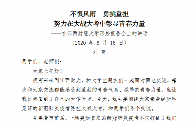 6月24日下午,公司全体党员学习省委书记刘奇同志在江西财经大学形势政策报告会上的讲话精神,刘奇书记的宣讲在公司教师党员中引起强烈反响,大家纷纷表示,这场形势报告对提高自己的政治觉悟、思想认识大有裨益,一定要深入学习贯彻习近平新时代中国特色社会主义思想,要爱党、爱国、爱社会主义,要努力学习,珍惜好时光,为国家发展贡献自己的青春力量,牢记“立德树人”根本任务,坚守“为党育人、为国育才”的使命与担当。