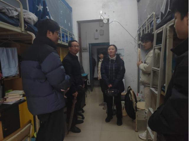 2024年2月26日,新学期开学第一天,建筑工程公司党委书记胡洁带领全院班主任及辅导员走访员工寝室,副书记吴发根、副经理张小义陪同走访。