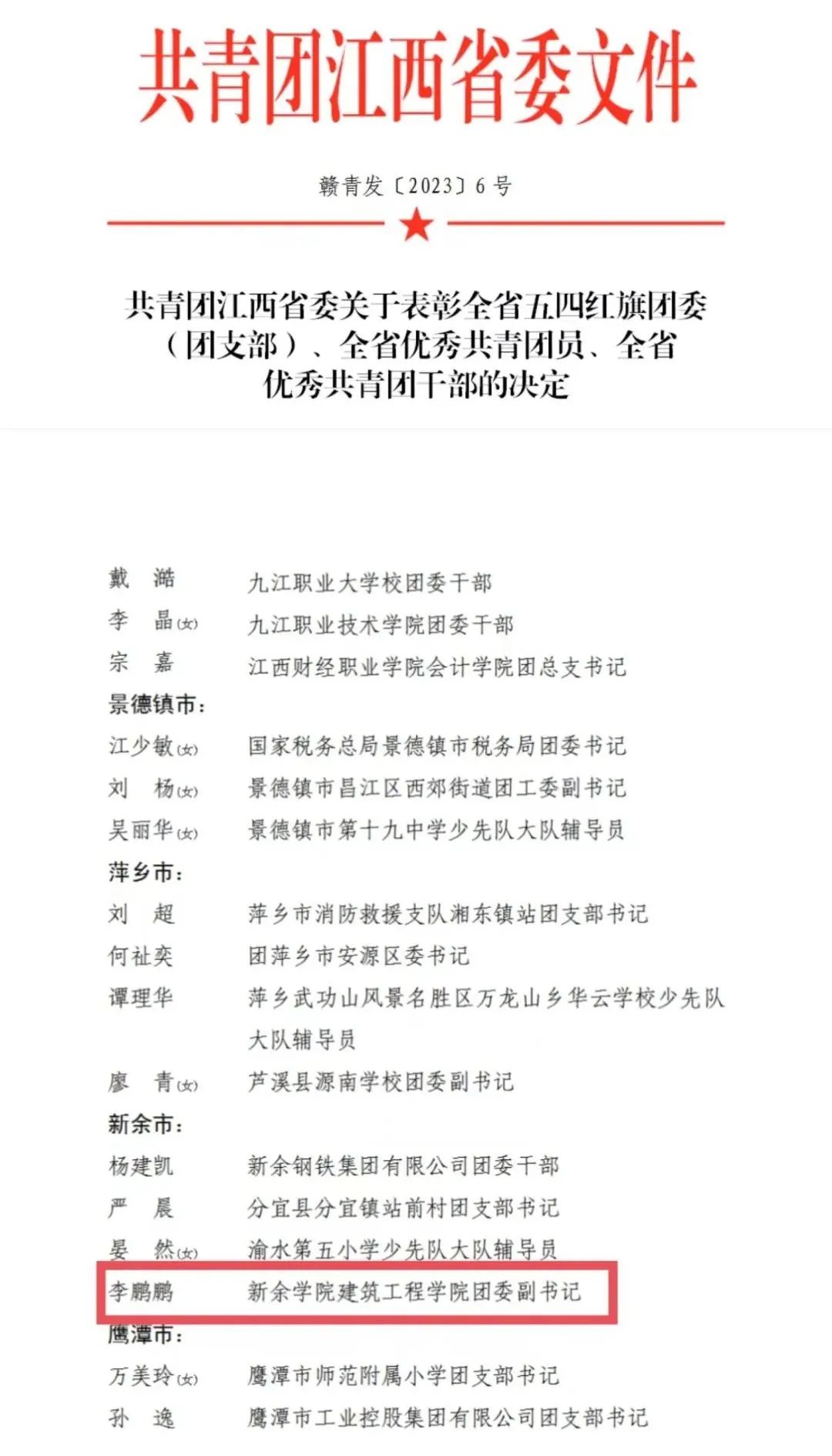 近日,共青团江西省委印发了《关于表彰全省五四红旗团委(团支部)、全省优秀共青团员、全省优秀共青团干部的决定》。公司团委书记李鹏鹏荣获“全省优秀共青团干”称号。