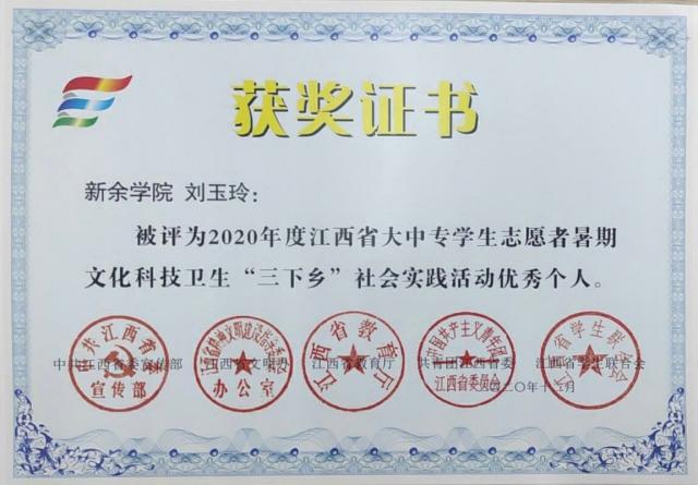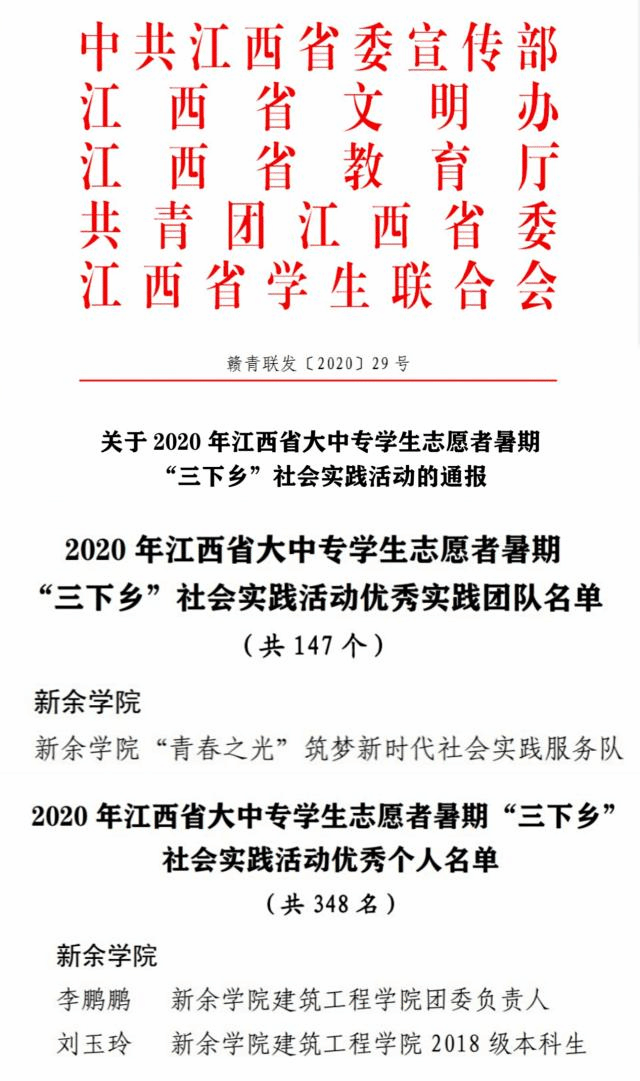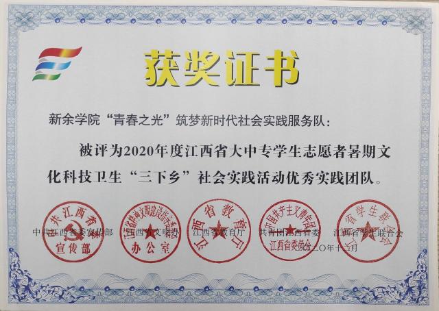在关于2020 年江西省大中专员工志愿者暑期 “三下乡”社会实践活动的通报中,公司“青春之光”筑梦新时代社会实践服务队荣获2020 年江西省大中专员工志愿者暑期 “三下乡”社会实践活动优秀实践团队称号,公司团委负责人李鹏鹏、18工程造价2班员工刘玉玲获2020 年江西省大中专员工志愿者暑期“三下乡”社会实践活动优秀个人荣誉称号。