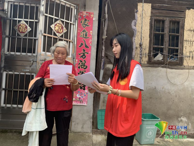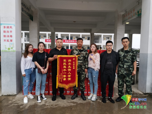 图为实践队队员和社区主任一起为抗洪英雄赠送锦旗