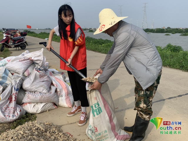 图为实践队队员和抗洪村民一同准备防洪工具(鹅卵石装袋)
