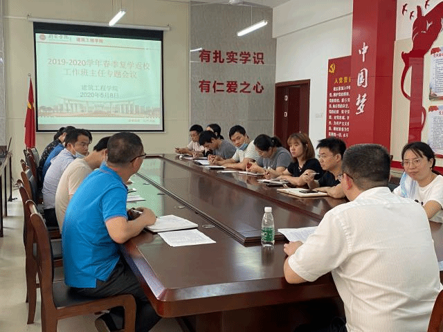 ​  ​为了贯彻落实省委、省政府关于统筹疫情防控和经济社会发展“两手抓、两不误”工作部署,教育部应对新冠肺炎疫情工作领导小组《关于做好2020年春季学期高校开学有关工作的通知》(教电〔2020〕139号)和《关于做好2020年春季学期全省员工返校学习有关工作的通知》(赣新冠指明电〔2020〕52号)及《关于进一步做好全省高校员工返校学习相关工作的通知》(赣教高字〔2020〕6号)等精神,在做好学院疫情防控工作的前提下,推动2020年春季学期员工有序返校复学工作,5月8日下午,公司在院会议室召开2020年春季复学返校工作班主任专题会议,公司党委书记、经理徐理主持会议,公司党委副书记吴发根、员工管理科科长钟鑫及全院班主任参加会议。