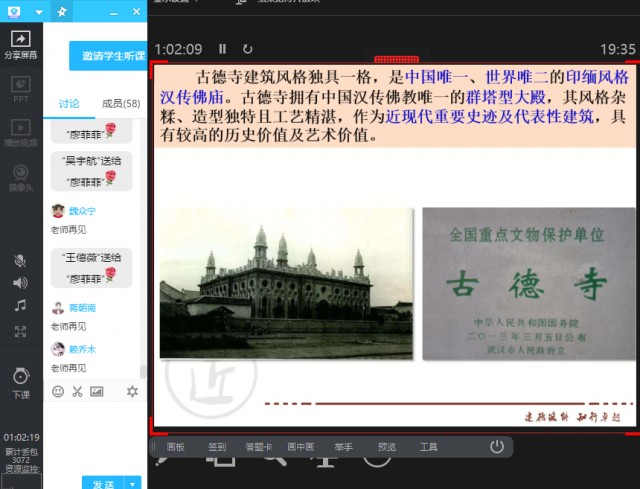 活动中,曾海明老师向同学们分享了“八一起义”纪念馆,利用详实的数据剖析了纪念馆的建筑特色,并以“第一枪”、“军旗”等红色元素引导大家回顾“八一起义”革命历史,阐述了“八一精神”的深刻内涵;卢志峰老师为大家解读了上海中心大厦的建筑结构和施工技术等特点,并以其工程建设为引例讲述了我国工匠攻关克难的拼搏事迹,充分激发公司员工民族自豪感;廖菲菲老师则向大家介绍了我国传统建筑-武汉古德寺,对其建设沿革、建筑特点、建筑组成及建筑风格的成因进行了详细解说,并以其成名内涵深入拓展到当前国家担当、社会担当和老员工担当。