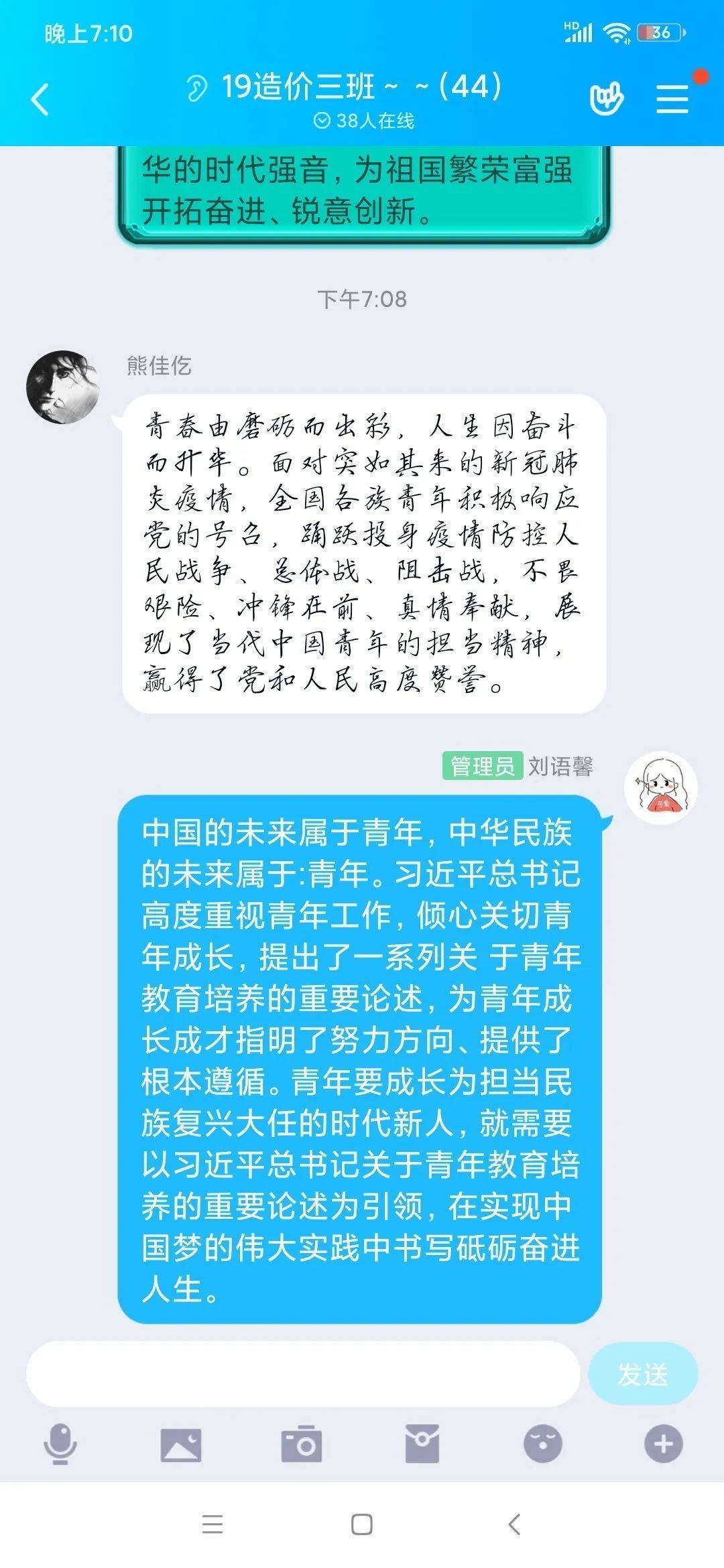 19造价3班团支部本次邀请到了来自19土木工程1的李思凡同学为大家分享他的战疫故事。他分享到,在抗击疫情的战斗中,志愿者抗击疫情是一场特殊战役,从宣传值守到生活服务,从心理支持到社会支持,志愿者们都是用细致入微的服务筑起了“疫”境中的爱心长城!他表示,自己只是做了一些小事情去帮助大家,但心里已经很满足。