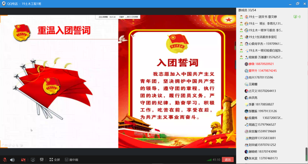 19土木工程1班团支部邀请了参加抗疫服务的李亚红和李思凡同学分享他们参加抗疫的经历。他们表示,身为一名共青团员,要时刻牢记:中国共青团是共产党的后备军。他们觉得这些都是他们应该做的,虽然有点累,但是心里很暖、很充实。在听完李亚红和李思凡同学所分享心得与体会,同学们纷纷发出了他们的感慨与敬佩之意。