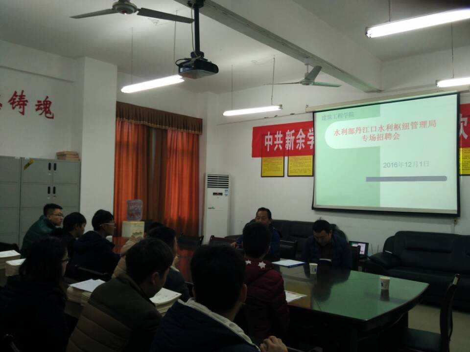 12月1号上午10:00水利部丹江口水利枢纽管理局张经理和助手来到我们建筑工程学院进行招聘。院员工科科长黄新仁和就业干事刘维刚与前来应聘的十多位毕业班员工出席了本次招聘会。