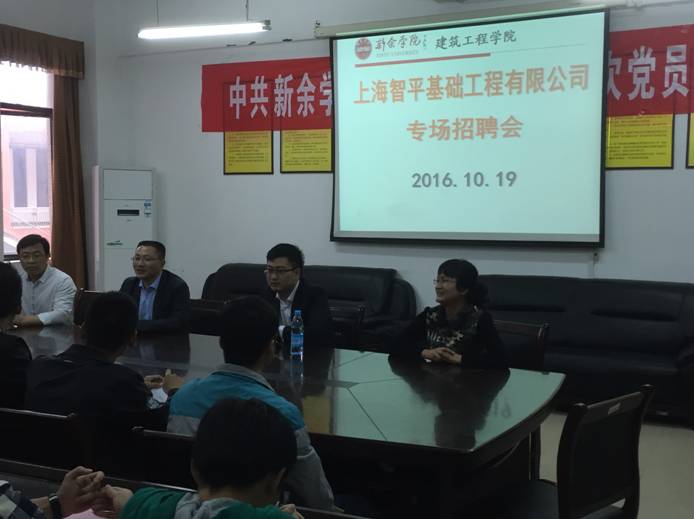 10月19号下午2:00,上海智平基础工程有限公司张经理来到建筑工程学院进行招聘。副经理徐理、公司党委副书记钟益兰、员工科科长黄新仁以及前来应聘的二十多位莘莘学子出席了本次招聘会。